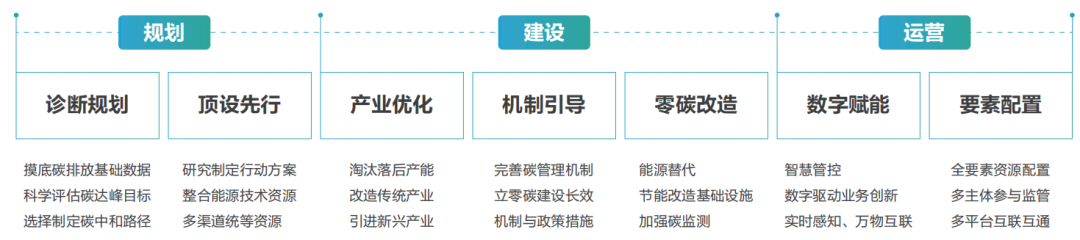 · 零碳改造:加强低碳基础设施建设,对园区用水、用电、用气等基础设施建设实施低碳化、智能化改造。加强园区数字化改造,建设碳监测体系,建立能源消耗和碳排放统计监测平台,加强对园区工业、建筑、交通用电等基础数据统计,建立并完善企业碳排放数据管理和分析系统。